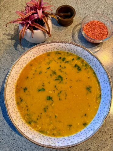 A light, tangy Bengali-style red lentil dish infused with green chillies, lime, and a fragrant ghee tempering-perfect with steamed rice.