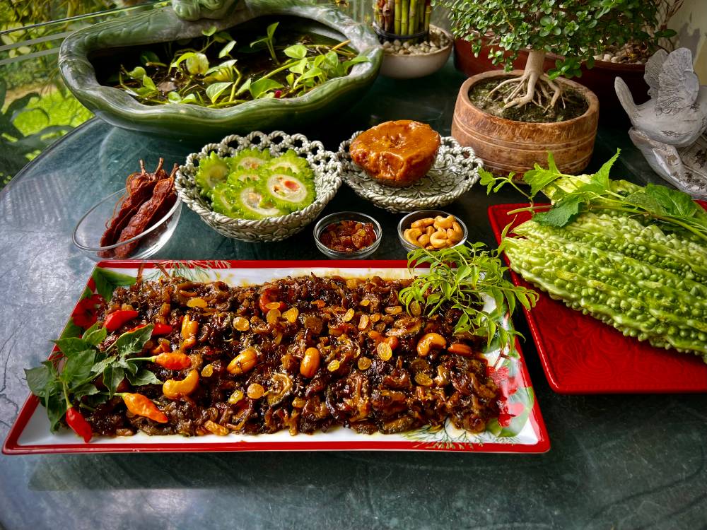 - Add the fried bitter gourd and cook until the water evaporates and the oil separates from the sauce.