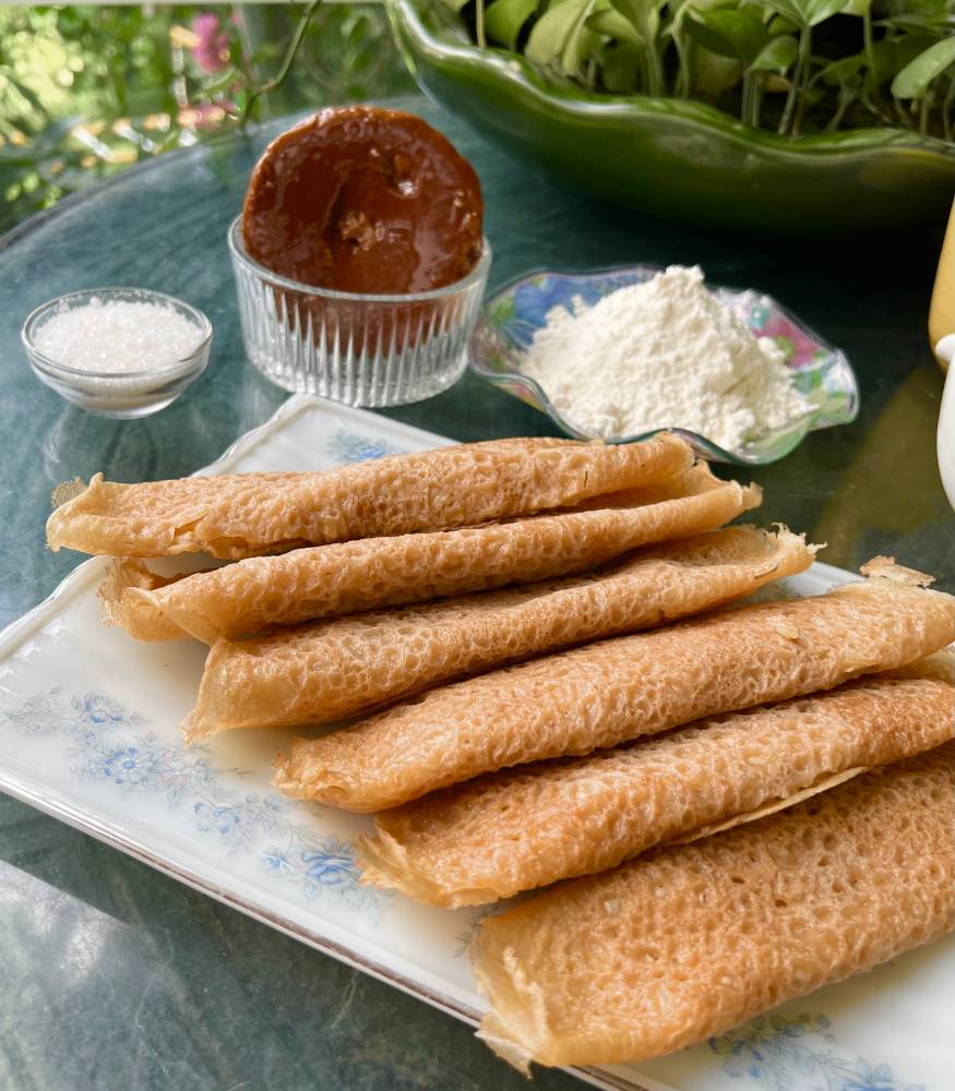 • Fill and roll: Spoon 1-2 tbsp of the coconut-khoya filling along one edge of the crepe. Gently roll it up like a spring roll. Transfer to a platter and repeat with the remaining batter and filling.